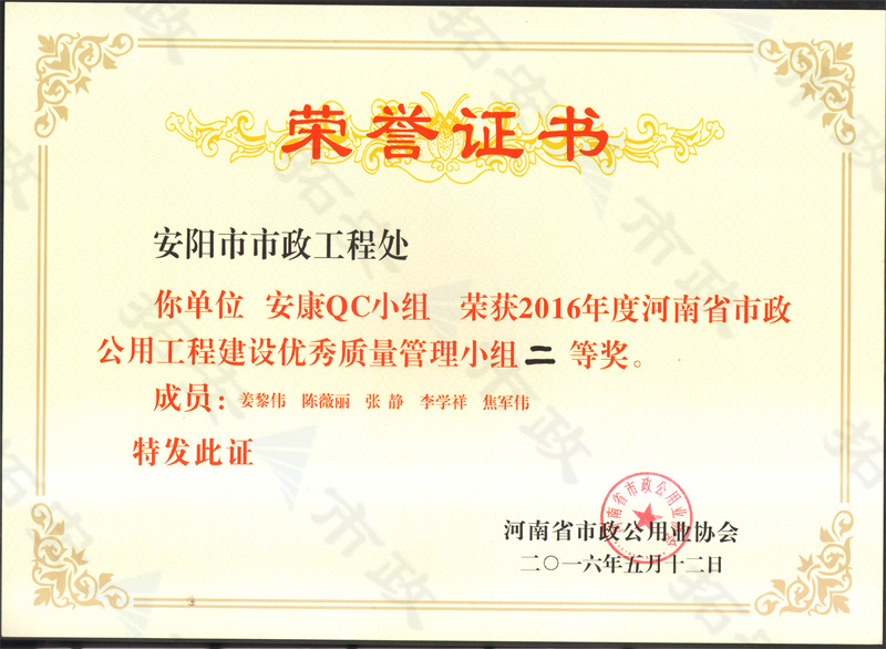 (省級)安康QC小組榮獲河南省市政公用工程建設優 秀質量管理小組二等獎